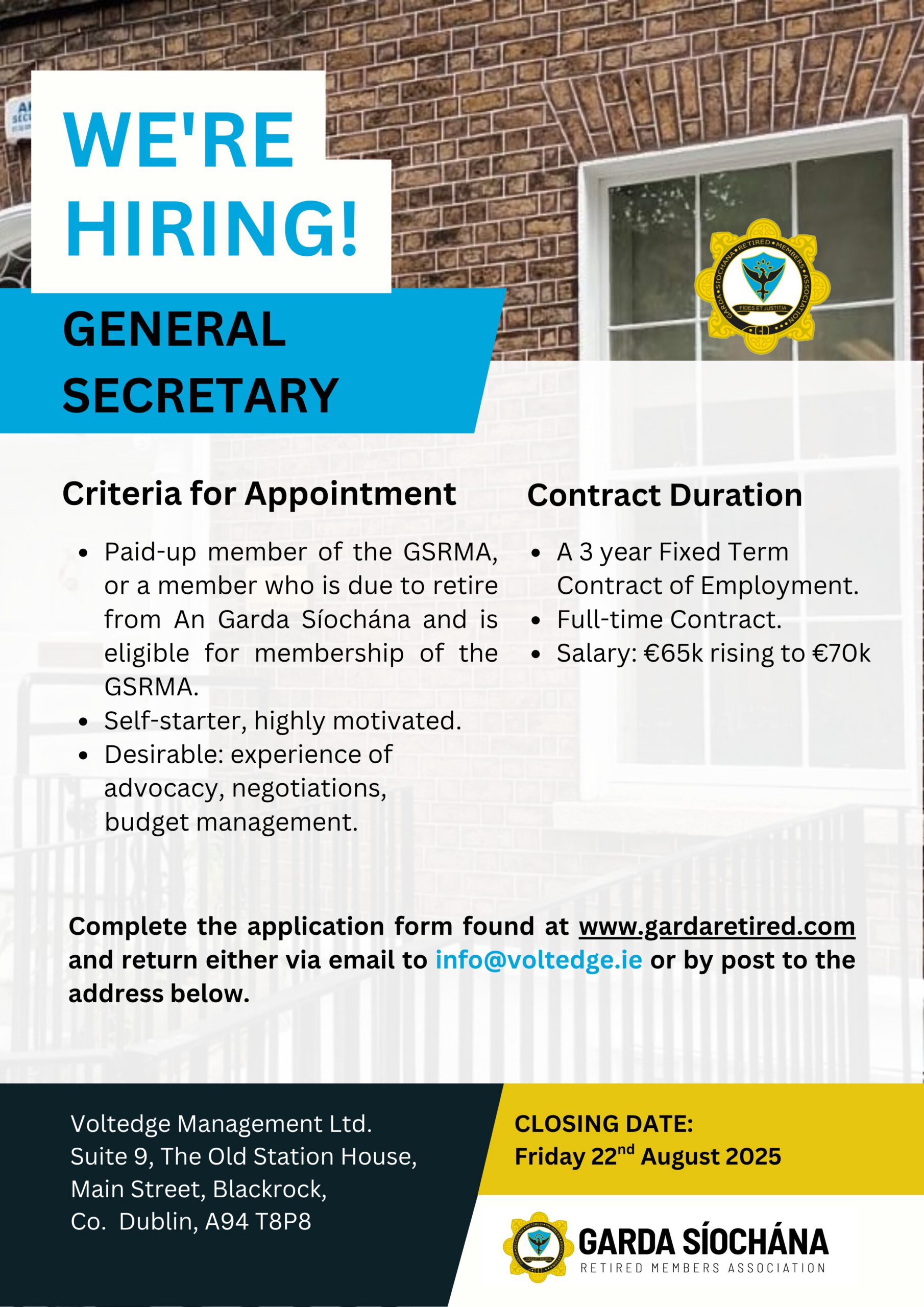 The Garda Siochana Retired Members Association is recruiting a General Secretary. Please review the advert below for more information. Applications close on Friday 22nd August 2025.